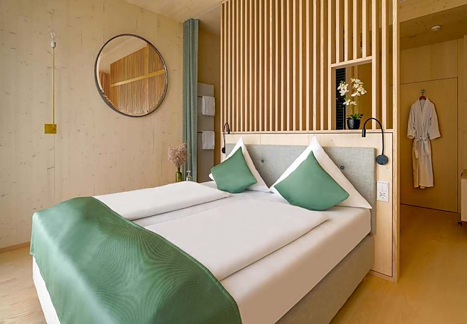 Guest rooms feature soundproofing, garden views, and balconies, while on-site amenities cover relaxation and convenience: Spa/Wellness packages, Sauna (free), free Parking (on site), free Wifi, and a Restaurant and Bar. The hotel is Pet Friendly (extra charges) and includes a Sun deck, Terrace, Garden, Elevator, and non-smoking rooms, with Upper floors accessible by elevator and Free toiletries in the bathrooms.